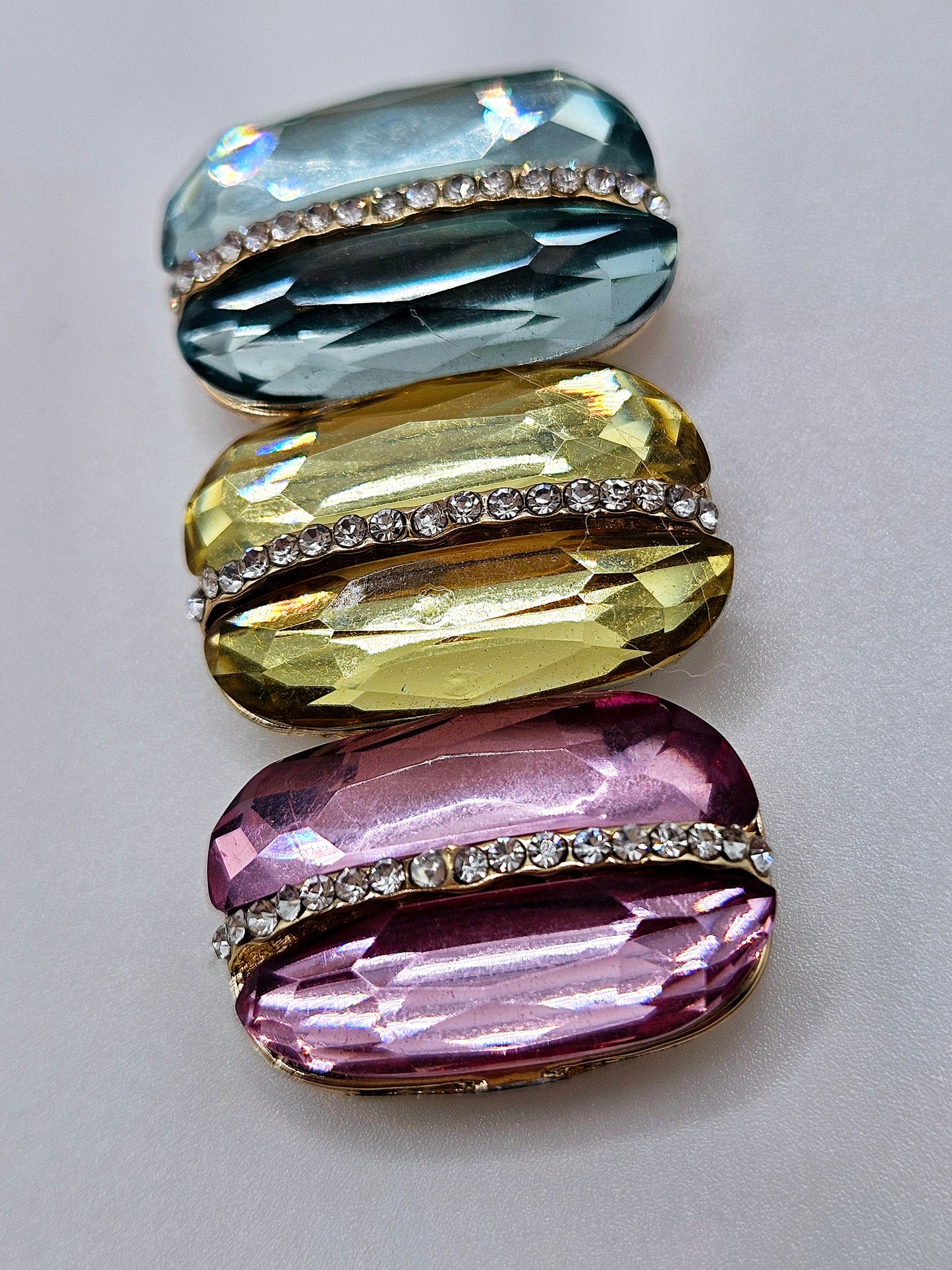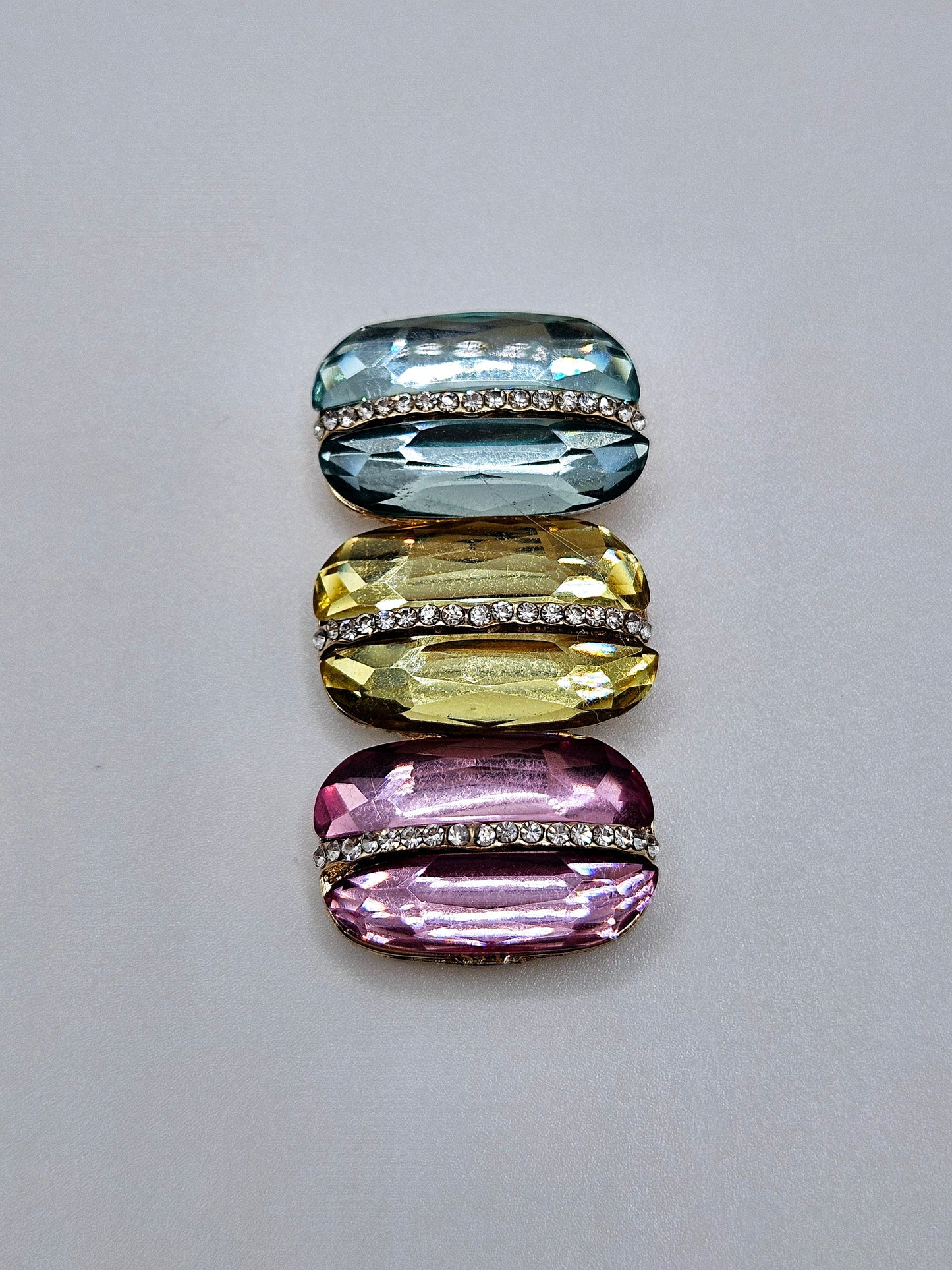 Cute three stacked macaroon coverminder with rhinestones. It has a 10 mm magnet attached to the bottom, and a second magnet is included to assist in keeping the diamond painting cover pulled back on your wip.